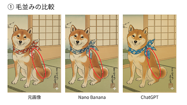 ChatGPTの方が少し薄く、毛並みの色の濃さが変化した。