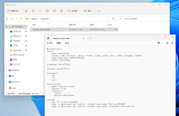 これらの個人設定は、共通のイメージに含めることはできません。開発者ごとに異なる設定が必要な上、項目によってはセキュリティリスクになることもあるためです。こうした環境ごとに異なる設定は、初回起動時に自律的に行うべきです。そしてこれを実現するのが「cloud-init」です。今回はWSLでcloud-initを使う方法を紹介します。
