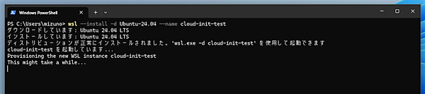 - sudo -u developer git config --global user.email (自分のメールアドレス)user-dataが作成できたら、Ubuntu 24.04を新しくインストールして、正しく初期化が行われるか見てみましょう。PowerShellを起動して、以下のコマンドを実行してください。ここでは--nameオプションを使用してディストリビューションに名前を付けています。現在のWSLでは、このように固有の名前を付けることで、同一のディストリビューション(ここではUbuntu 24.04)をPC上に複数インストールできるのです。