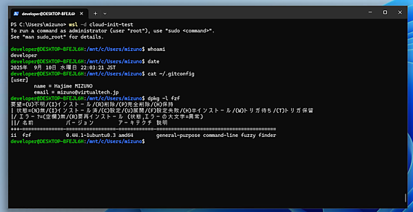 $ wsl -d cloud-init-testインストールしたディストリビューションを起動したら、cloud-initの内容が反映されていることを確認しましょう。developerユーザーとしてログインしており、タイムゾーンは日本になっています。またGitの個人的な設定が既に行われており、fzfパッケージも追加されています。