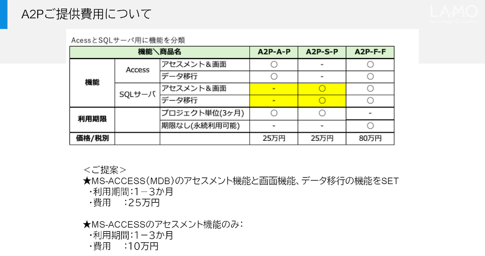 柴田氏は説明する。「テーブル定義とデータ移行は評価版として今後、無償配布を検討しています。ただしアセスメントはシステム設計の要になるため有償とします。まずは気軽にデータ移行から試していただきたいですね」