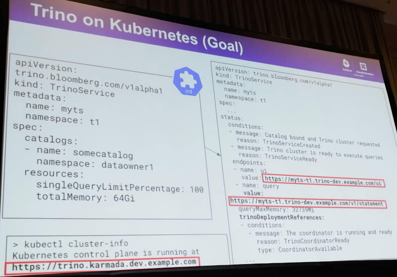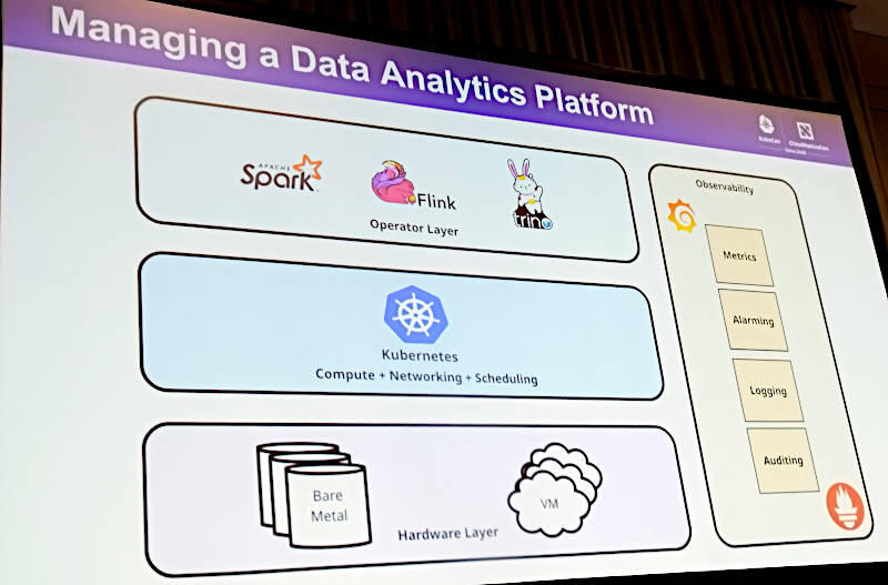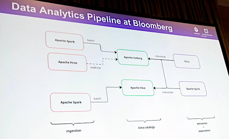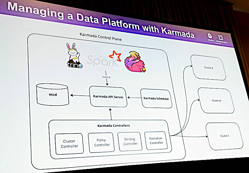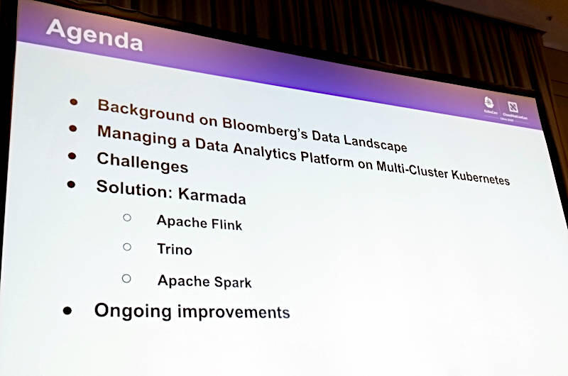 KubeCon+CloudNativeCon China 2025にて、金融情報サービスの最大手Bloombergが行ったセッションを紹介する。セッションのタイトルは「How Bloomberg Creates a Resilient Data Analytics Platform Using Karmada」というものだ。データ分析のためのシステムをマルチクラスターのKubernetes上に構築し、エンドユーザーからのアプリケーション配備と運用管理者によるフェイルオーバーやアップデートをオープンソースのKarmadaを使って実装したユースケースの解説を行う内容となっている。データ分析のためのアプリケーションについてはリアルタイム分析のためにApache Flink、バッチジョブのためにApache Spark、そしてデータへのクエリーエンジンとしてTrinoを利用している。複数のKubernetesクラスターへのアプリケーション実行制御と、リソース最適化のためのスケジューラーとしてKarmadaを使っている。Kubernetesのアップデートやフェイルオーバー、リカバリーを行うのはKarmadaのオペレーターフレームワークだ。セッションを行ったのはMichas Szacillo氏とIlan Filonenko氏だ。