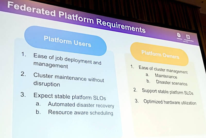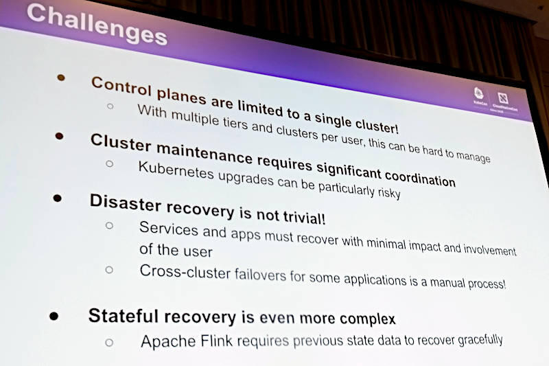 //image[3855805][ //}ここでこのシステムを構築するに当たっての解決しなければいけない課題を紹介。具体的には、単一のクラスターではなく複数のクラスターを使う必要があること、Kubernetesにおいては必須となる短期間で行われるシステムのアップデートに追従していく必要があること、障害時のリカバリーを自動化すること、そしてスナップショットなどを含めてステートフルなアプリケーションとデータに対応する必要があることなどを挙げた。ここでは特にマルチテナンシーについては触れられてはいないのが興味深い。過去のKubeCon Chinaでのセッションなどから予想すれば、中国企業のユースケースであればマルチクラスターとマルチテナンシーがセットになっていることを考えると、Bloombergほどの企業であってもマルチテナンシーが要件として挙げられていないのはやはりベースとなっている企業の組織の在り方の違いということだろうか。