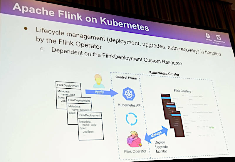 さらにApache FlinkをKubernetes上で稼働させる場合、Kubernetesの標準的なカスタマイズの方法であるオペレータとカスタムリソースで実装できることが要点だろう。これによってパブリッククラウドでもオンプレミスでも、Kubernetesの作法を知っていれば運用は容易になる。