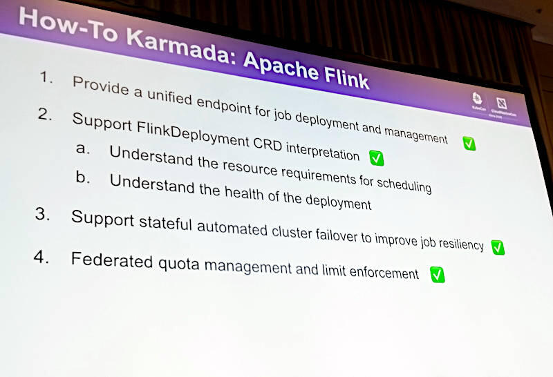 Karmadaによって複数のクラスターのエンドポイントを統合的に管理できること、FlinkのCRDによるマッチングに対応していること、自動クラスターフェイルオーバーのサポート、複数のクラスターを横断したクォータ管理などがKarmadaによって実現できることを整理している。