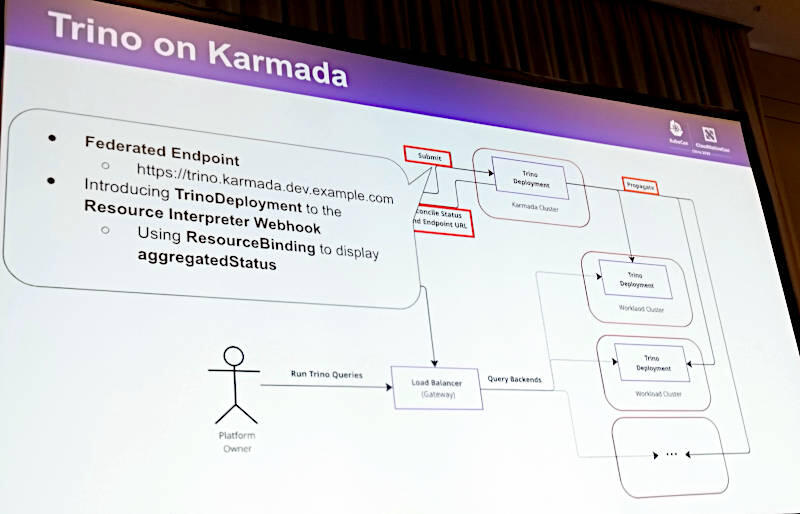 TrinoについてはANSI SQLに準拠した分散型のスケーラブルなクエリーエンジンであり、BIツールとも連携できることなどを紹介。そしてKarmadaによってアプリケーションからクラスターを抽象化した発想と同様にTrinoからの検索についてもエンドポイントを抽象化できることを説明した。