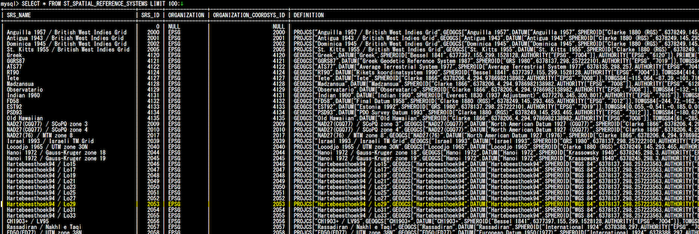 -> FROM ST_SPATIAL_REFERENCE_SYSTEMS