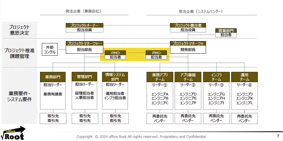 そうした意識の現れとして、事業会社のプロジェクト開始前に「体制図を見せてください」と言うと、会社の組織図が提出されることもよくあります。また、「プロジェクトのためにPMOを配置する」という文化も、ベンダー会社ほど一般的ではありません。