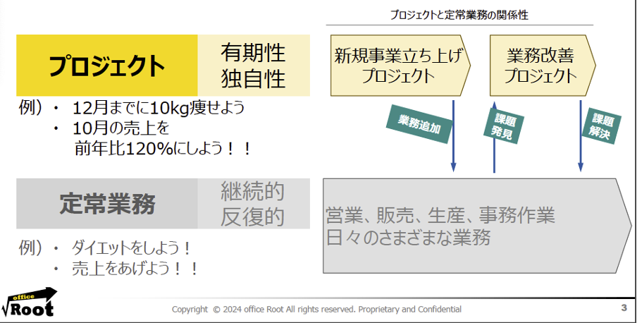 多くの人にとって仕事は、日々継続的に行う「定常業務」と、一時的に行う「プロジェクト」に2分されます。さらに定常業務は、例えば「月末の締め業務」や「決算処理」といった月次や年次の業務などにも分けられますね。