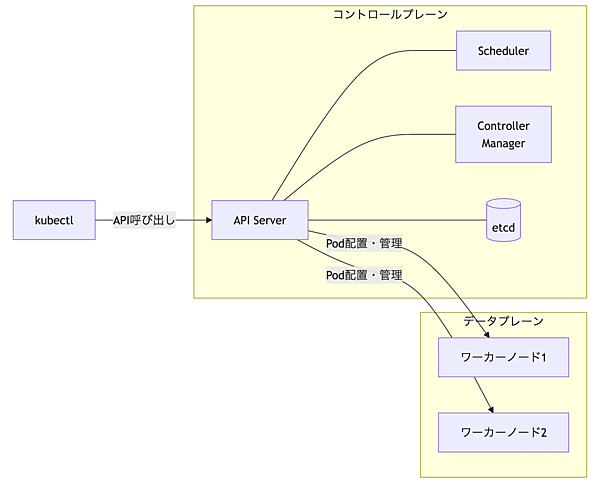クラスター全体を管理する「司令塔」でAPI Server、Scheduler、Controller Managerなどが含まれる - データプレーン(ワーカーノード)