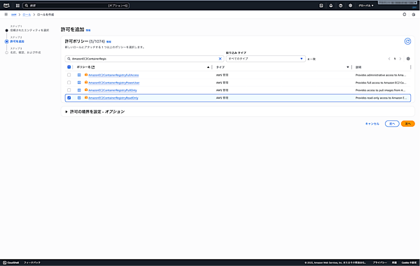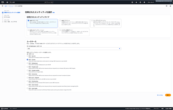 - ポリシー: 「AmazonEKSClusterPolicy」が自動選択される