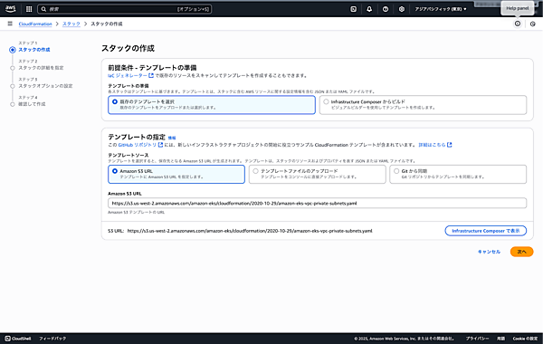 - テンプレートURL: AWSが提供するVPCテンプレートを指定