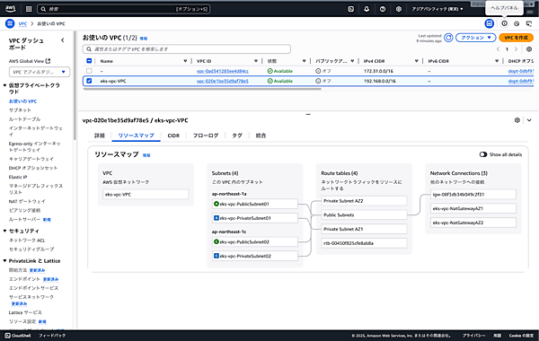 作成されたVPCには、パブリックサブネットとプライベートサブネットが2つのAZに配置されます。