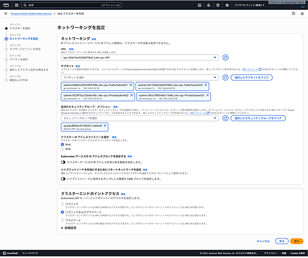 - クラスターエンドポイントアクセス: 「パブリックおよびプライベート」