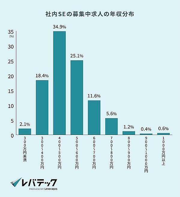 レバテックが保有するデータでは社内SEの平均年収は「469万円」とエンジニア全体の平均年収504万円と比較すると35万円の差があります。