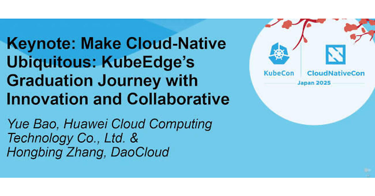 KubeCon+CloudNativeCon Japan 2025の2日目のキーノートは中国のHuawei CloudとDaoCloudによるKubeEdgeプロジェクトの紹介を行う内容となった。セッションの後半では、KubeEdgeがプロジェクトの最終ステージとも言えるGraduationをクリアしたことも解説されている。タイトルは「Make Cloud-Native Ubiquitous:KubeEdge's Graduation Journey with Innovation and Collaborative」というもので、前半のプロジェクト紹介をHuawei CloudのYue Bao氏、後半のプロジェクトのGraduationについてはDaoCloudのHongbing Zhang氏が行った。