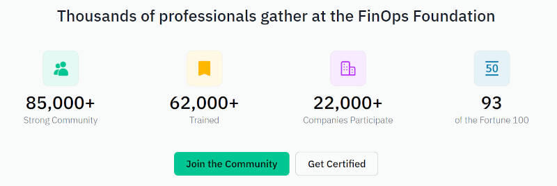 FinOps Foundationには85,000人のコミュニティメンバーと22,000社の企業が参加しているが、特徴的なのは62,000人がトレーニングを受けたという部分が強調されていることだろう。LF/FinOps Foundationがトレーニングと認定試験を重視していることが現れている。FinOps Foundationのターゲットは主にエンジニアや財務の担当者レベルであることが想定される。