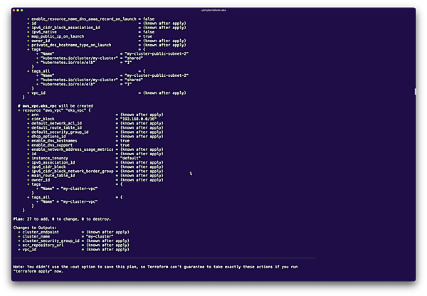 Plan: 27 to add, 0 to change, 0 to destroy.約27個のリソースが作成されることが確認できます。