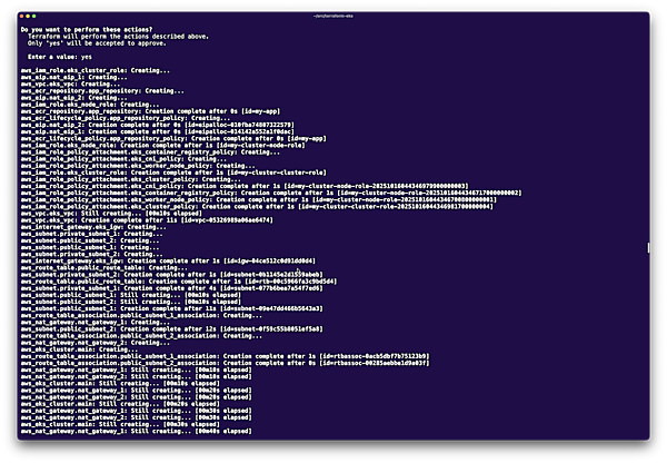 Enter a value: yesリソースの作成には10〜15分程度かかります。完了すると、以下のような出力が表示されます。