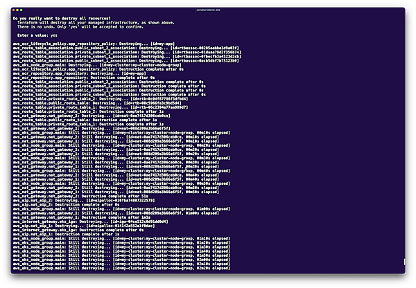 また、Kubernetesで作成したLoadBalancer(ELB)などは、Terraformの管理外のため自動削除されません。事前に手動で削除するか、またはterraform destroy実行後に残っているリソースを手動で削除してください。