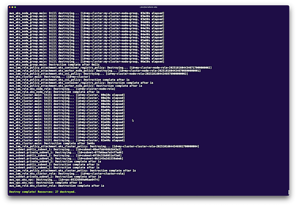 $ terraform destroy【重要】: この操作は取り消せません。本番環境では十分に注意してください。