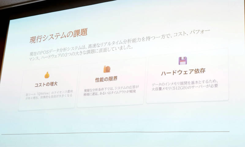 次に登壇した永産システム開発の生方氏は、顧客案件としてQlikViewを使って開発したPOSデータ分析システムにおいて、代替としてClickHouseのシステムを採用したことを解説。