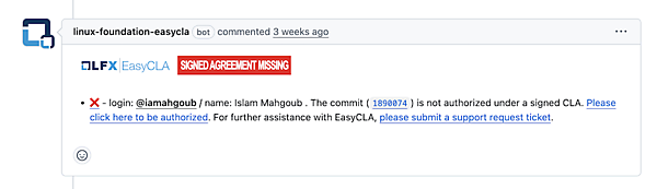 初めてのPRを作成するとlinux-foundation-easycla botが自動でコメントを返してくれ、署名状況や手順のリンクが表示されます。「SIGNED AGREEMENT MISSING」と赤字で表示されている場合はまだ署名が完了していないことを意味し、クリックすると署名手続きのページに移動できます。CLAにサインアップする際は、Gitに設定したコミット用メールアドレスとCLA登録用メールアドレスが一致していることを確認してください。メールアドレスが異なると、PRの自動チェックで失敗することがあります。