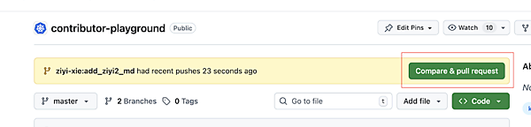 ブラウザで「kubernetes-sigs/contributor-playground」にアクセスすると、画面上部に「Compare & pull request」ボタンが表示されているはずです。これは、先ほどpushしたブランチを使って新しいPRを作成できるというサインです。ボタンをクリックして次に進みます。