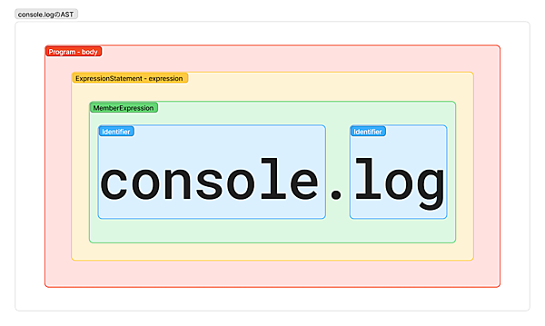 特に、ASTについて「Acorn」というJSパーサーを用いてconsole.log関数をパースしたものからデータの構造を深堀りしました。以下のようなJSON形式で表現しました。