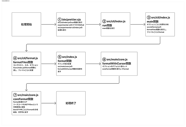ESLintのコードリーディングと同様に、Prettierのコードリーディングを通して、一般的なFormatterの処理のフローを理解します。コードはGitHubに公開されています。コミットID5067313の実装を読み進めます。prettierコマンドが実行されると、以下の流れで処理が行われます。