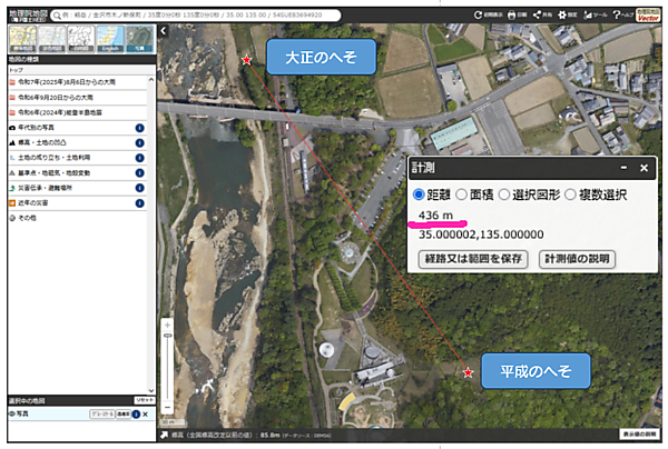 この2つの「35-135ポイント」間の距離を地理院地図を使って求めてみると、436mと計測されました。つまりこれは「北緯35度、東経135度ですよ」というデータを受け取ったときに、それが昔のTokyo測地系で表されたものだった場合に本来は地図左上のポイント(大正のへそ)の位置を表したものだったのに、右下のポイント(平成のポイント)の場所だと誤認してしまうことになります。地図上で思った場所と違う場所に表示されることになり、これは大事件です。本稿冒頭で「摂氏と華氏」の例を出しましたが、それと同様に、この緯度経度はどの測地系で表したものかの単位を正しく認識して使うことの大切さが分かります。