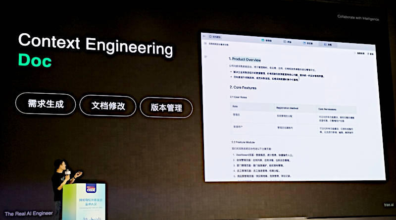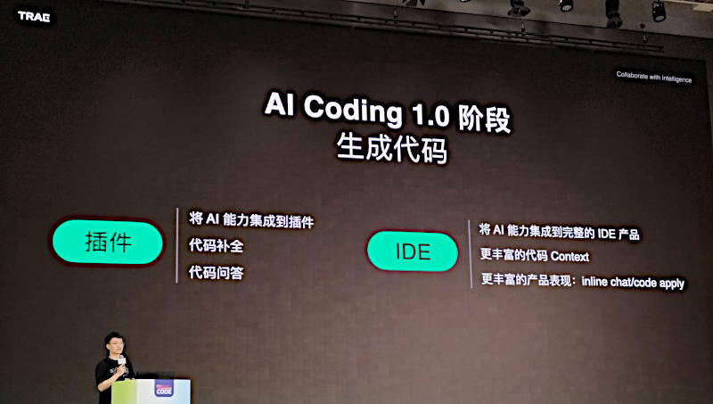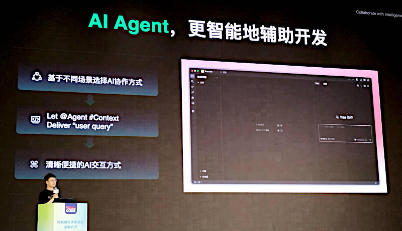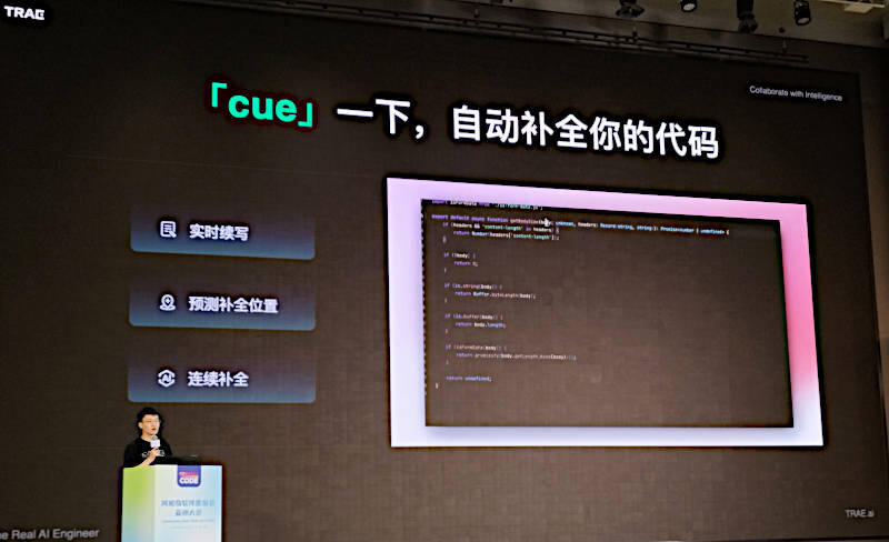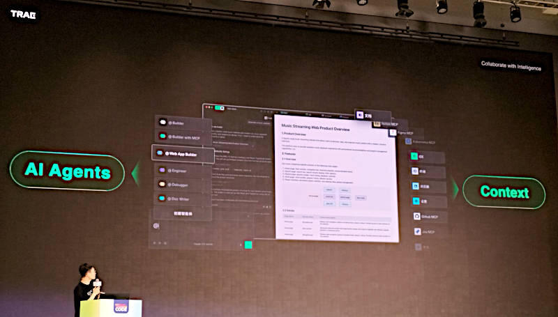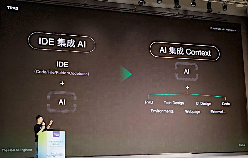 プレゼンテーションを行ったのはTRAEのプロダクトマネージャーであるTao Wang氏である。プレゼンテーションは中国語、スライドもほぼ中国語という内容だったが、TRAEについては公式サイトが公開されている。TRAEはIDEのプラグインで生成AIを実装するのではなく、Visual Studio Codeからフォークしたコードを中心に生成AIの機能を組み込んだコードアシスタント以上の機能を提供する「リアルなAIによるソフトウェアエンジニア」というのが要約としては妥当だろう。