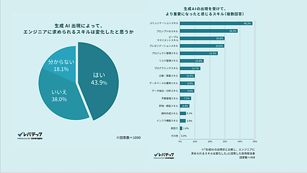 AIが単純なコーディングを可能にしたり、テスト業務をサポートするようになる中で、エンジニアに求められるスキルセットも変化しつつあります。IT人材を採用する企業の担当者のうち、約4割が「生成AIの登場によってエンジニアに求めるスキルは変化した」と回答しています。より重要になったと感じるスキルとしては「コミュニケーションスキル(48.3%)」が最も多い結果となりました。