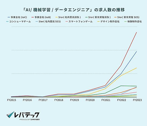 「AI/機械学習/データエンジニア」といった高度な専門知識を持つ職種の需要も急増しています。「消費者向け事業を行う会社(toC)」では23年度時点で20年度比7.7倍、「法人向け事業を行う企業会社(toB)」では9.4倍と大きな伸びを見せています。これは新型コロナウイルスの感染拡大による内製化の需要や、2022年11月に公開されたChatGPTの登場も追い風になったと考えられます。