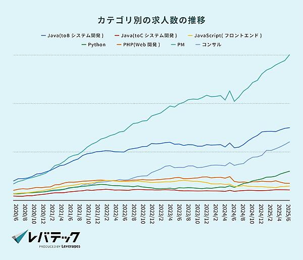 実際にレバテックの数値では、コーディング系の求人はほぼ横ばいの一方で、PMは直近1年で5割増、コンサルタントは7割増と大幅な伸びとなっています。