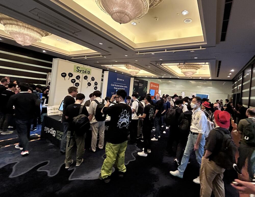 キーノート後は、休憩(コーヒーブレイク)のタイミングに合わせてスポンサーブースがオープンしました。数十のブースが設置され、どのブースも多くの参加者が紹介されているサービスや製品について説明を聞いたり、技術的なディスカッションが活発に行われていました。スポンサーブースでは各社のノベルティグッズ配布も行われていましたが、想定以上の参加者の反響に“グッズがものすごい勢いでなくなっていく”といううれしい悲鳴を多くのブース担当者から聞きました。