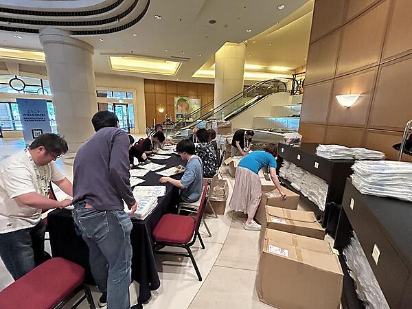 この日は、いよいよ会場内の設営開始です。設営するのは、受付・イベントノベルティ(Tシャツ)配布場所・ボランティアスタッフルームとなります。受付ではイベント本番で参加者が身に付けるバッジとストラップ、Day1後に行われる懇親会のドリンクチケットを配布するためのセッティングを行いました。また、設営完了後には国内・海外からの参加者を想定して受付対応の練習を実施しました。