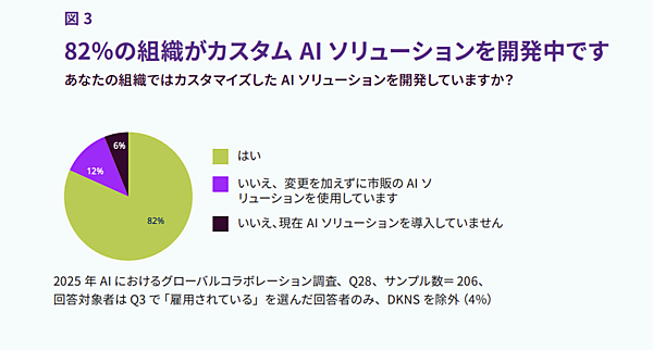 すでに多くの組織ではソブリンAIに向けた第一ステップとしてAIモデルのカスタマイズが進められており、これらのカスタマイズの多くがオープンソースのフレームワーク、ツール、基盤モデルをベースに作られていますが、現状で82%の組織がすでにカスタムAIソリューションを開発しています。これらのカスタマイズは米国や大規模組織で顕著になっていますが、その他の地域やすべての規模の組織で高い傾向を示しています。