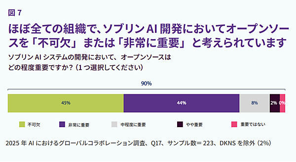 ソブリンAIとオープンソースの関係は、どのように考えられているのでしょうか。今回の調査では、オープンソースはソブリンAIの基盤であり、回答者の90%が「不可欠」または「非常に重要」と回答しています。