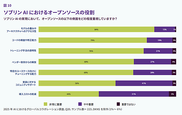 では、オープンソースはソブリンAIの実現に当たって、どのような役割を果たしているのでしょうか。図10にあるように「モデルの重みやアーキテクチャへのアクセス性」が84%の首位であり、これらの要素がモデル動作の理解と制御に不可欠であると認識されていることを示しています。