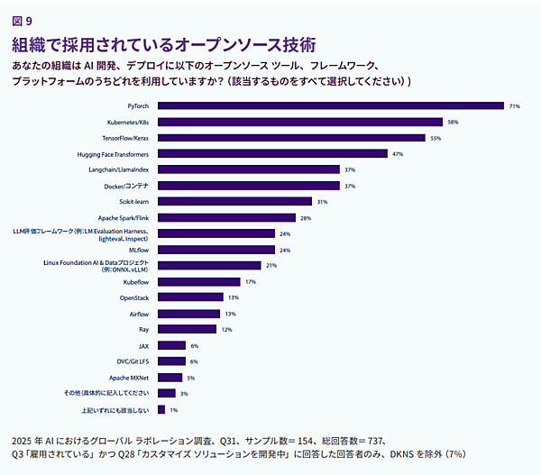 自組織で採用されているオープンソースAI技術に関する回答が図9に示されています。AIおよび機械学習開発フレームワークではモデルの構築、トレーニング、微調整のための基盤ソフトウェアが提供されており、多くの回答者がそれに言及しています。このカテゴリーではディープラーニングフレームワークが主流で、PyTorchが71%の採用率でトップであり、その人気を反映しています。