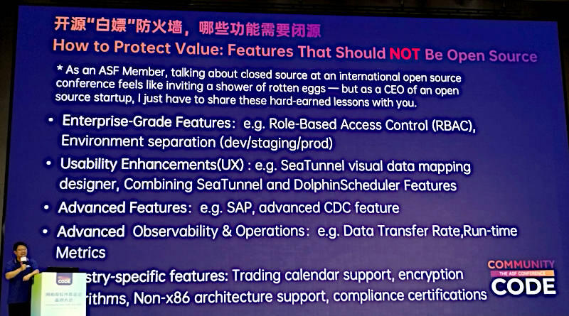 オープンソースプロジェクトは何よりもそれを作りたいという意欲からスタートするものの、それがビジネスとして持続するための計画が最初から備わっているわけではないことを説明。この辺りはGuo氏自身がApache DolphineSchedulerとApache SeaTunnelというプロジェクトのコアメンバーであり、その商用版としてのWhaleOpsを作った経験からのリアルな体験談ということだろう。ちなみにDolphineSchedulerはデータ処理のためのワークフロー、SeaTunnelはさまざまなデータを統合するためのツールであり、どちらもビッグデータシステムには欠かせない機能を提供するソフトウェアだ。