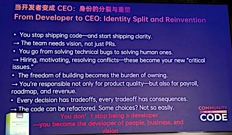 ここではGuo氏がデベロッパーからWhaleOpsのCEOとして仕事が変わった時に何が重要なのか? を経験から教えるという内容のスライドを使って解説した。コードをリリースすることからチームをまとめるためにクリアな方向性を示すこと、テクニカルな問題よりも人事やエンジニアのやる気を上げること、衝突の解決など多くの人的問題を解決する必要が出てくること、自由にソフトウェアを開発するという愉しみが、オープンソースソフトウェアを維持するという苦しみに変わること、CEOとして下した判断にはトレードオフと結果が伴うこと、単にコードを書くデベロッパーから、人材、ビジネス、ビジョンを開発し、維持していくデベロッパーにならないといけないと説明した。