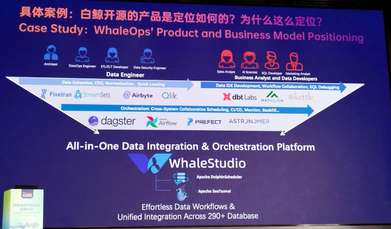 ここではWhaleOpsのビジネスを紹介。ASFのオープンソースソフトウェアDolphineSchedulerとSeaTunnelを組み合わせて、エンタープライズ版としてWhaleStudioという名称で提供している。単体のソフトウェアではなく自身がコミッターとして開発をリードするオープンソースソフトウェアを組み合わせて機能強化を行い、価格を付けて市場に提供するという方法だ。