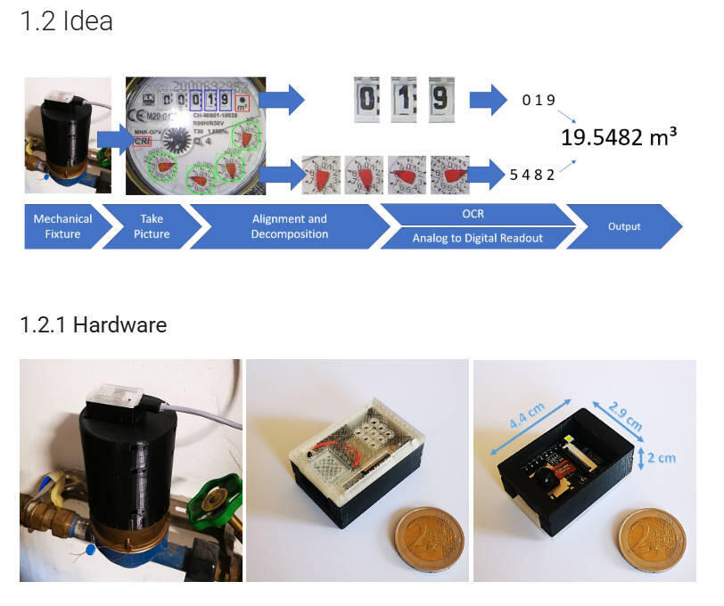 この画像の「1.2.1 ハードウェア」にある右側の写真には黒いプラスチック製の筒の上にESP32が設置されているが、これはメーター自体を黒い筒で覆うことで外部からの光を遮断し、ESP32のフラッシュを使うことで常に同じ露光、角度、距離で画像を取得する工夫である。