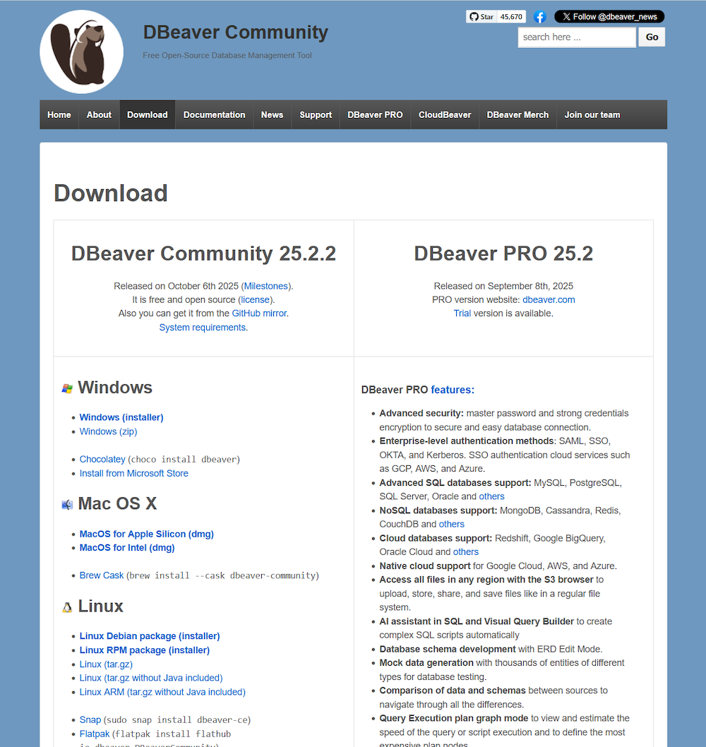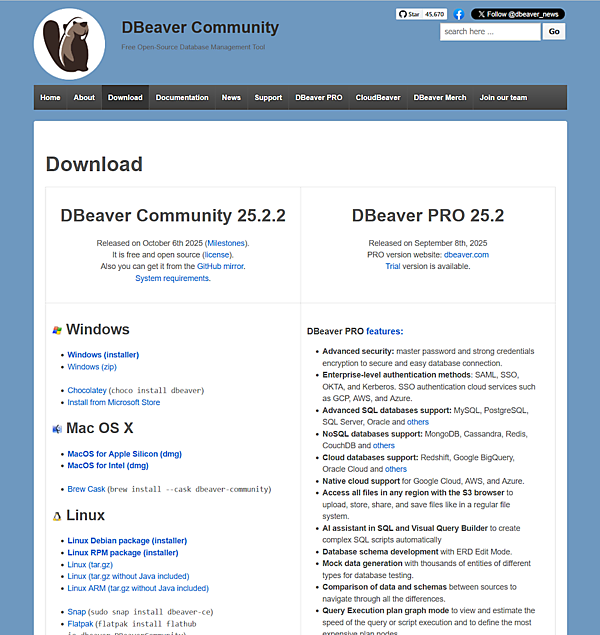 DBeaverはWindows、MacOS X、Linuxで動作します。Windowsはインストーラまたはzipで、MacOSはdmgで、Linuxはdeb/rpmパッケージやtar.gzにて配布されています。インストールに難しいところはないので、DBeaverのサイトを参考にインストールしてみてください。