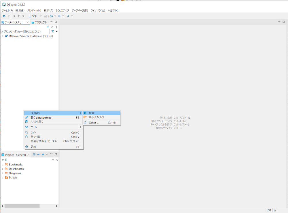 - インストールしたDBeaverを起動して、左側にある「データベースナビゲータ」内での右クリックが便利です。「作成」-「接続」と進みます。