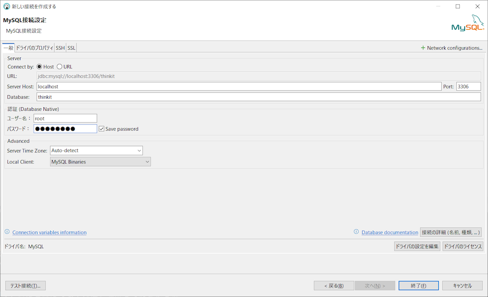 - MySQLの接続設定画面では接続情報を入力します。Server Host名、Database名、接続のためのユーザ名とパスワードあたりが主な入力項目です(MySQLサーバのポート番号を3306番以外に変更している場合はPortも)。左下にある「テスト接続」ボタンを押して正しく接続できることを確認しておくと良いでしょう。