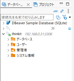 以上で接続設定は完了です。画面左側の「データベースナビゲータ」に作成した接続設定が表示されます(私はlocalhostの代わりにLAN内にある他のサーバ上のMySQLに接続しているためIPアドレスで表示されています)。