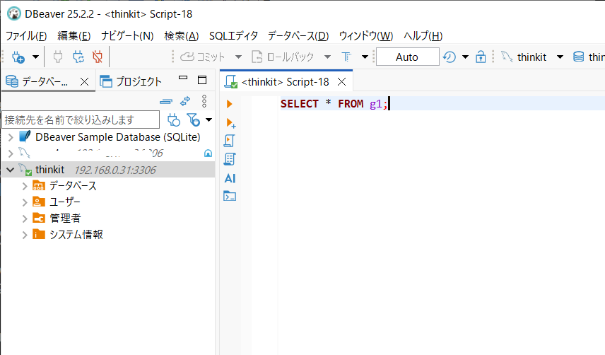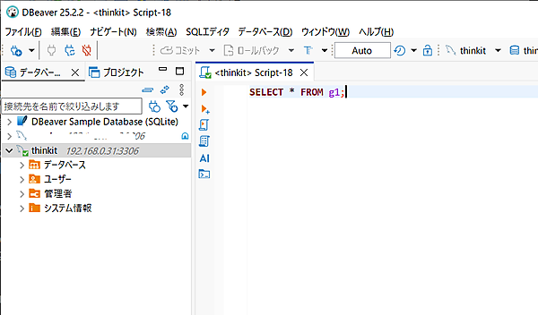 「データベースナビゲータ」内のデータベース名(ここでは“thinkit”)を右クリックして「SQLエディタ」-「SQLコンソールを開く」を選択すると、右側にSQLを入力するための真っ白な画面が表示されます。ここにSQL文を入力して実行することができます。ここでは前回作成した「g1」テーブルの全件を確認してみることにしましょう。
